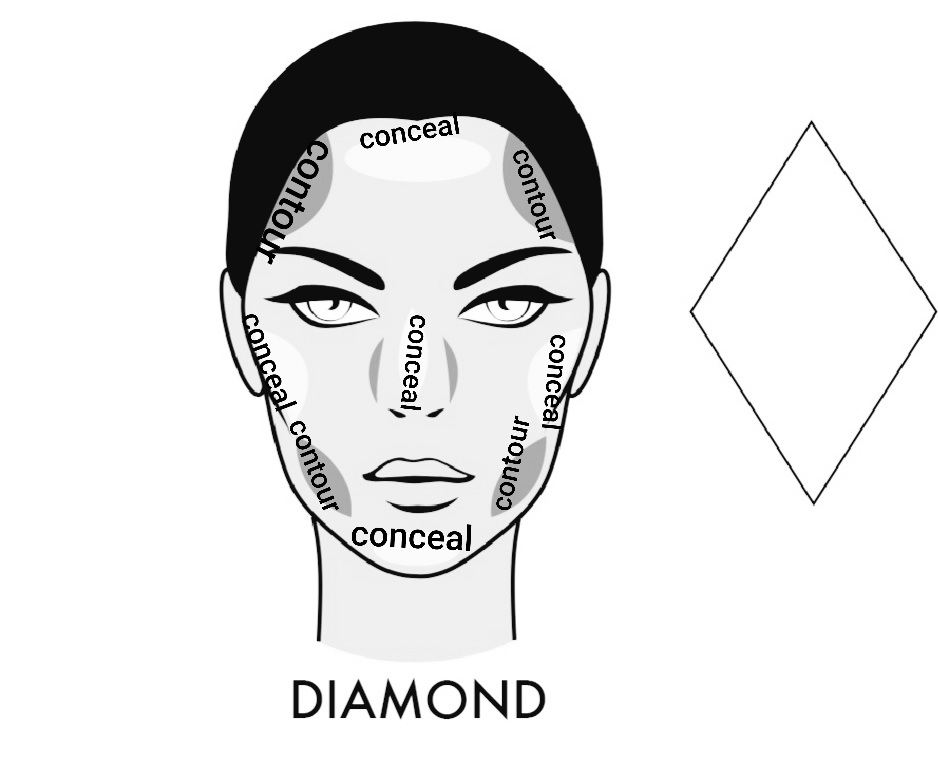 The diamond face shape: the diamond face shape also has its own unique and preferred way of contouring and concealing, it is shown in the image below. for more description on how to identify a diamond face shape view my previous post”
