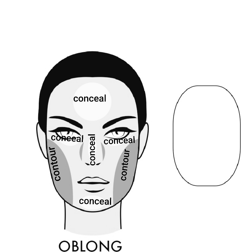 Oblong or long face shape: its own unique and preferred way of contouring and concealing is shown in the image below.