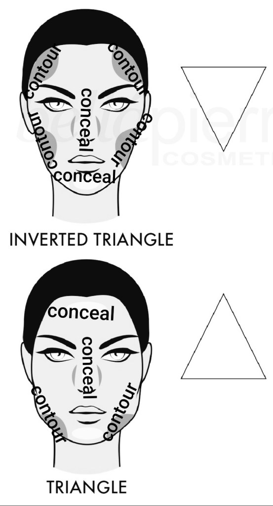 Triangle face shape: we have to different type of triangular face shape and its own unique and preferred way of contouring and concealing is shown in the image below.