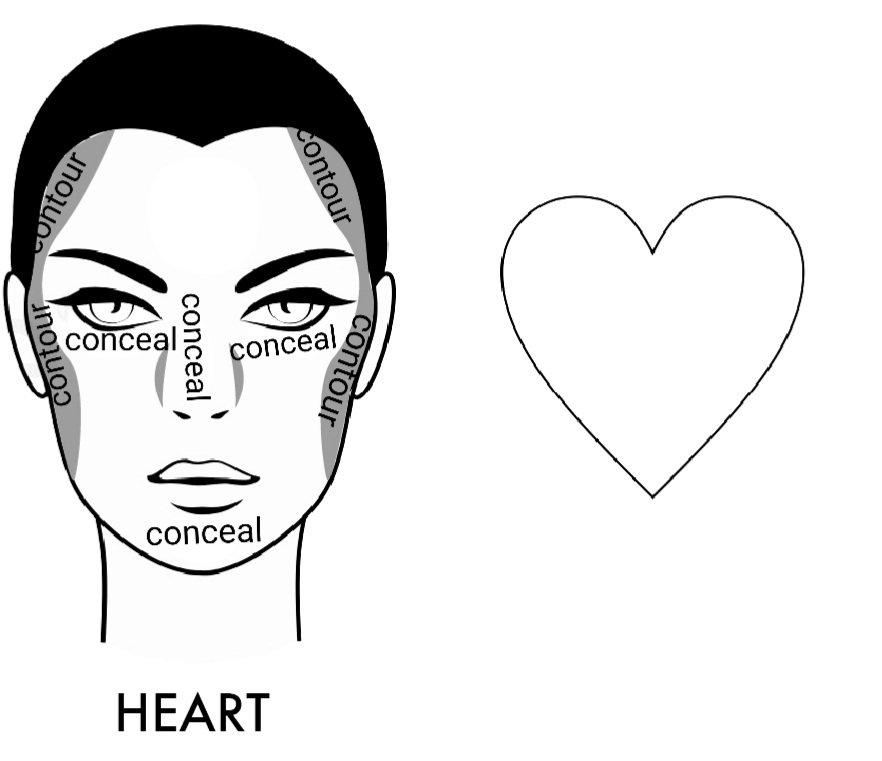 Heart face shape: the heart face is one of the most common face shape,its own unique and preferred way of contouring and concealing is shown in the image below.